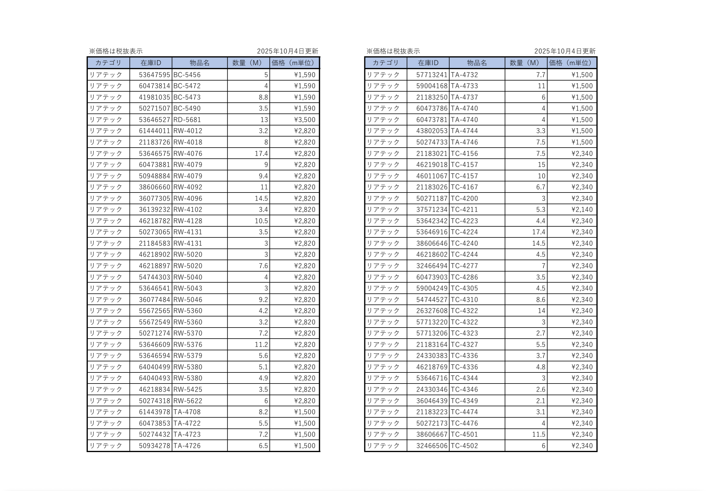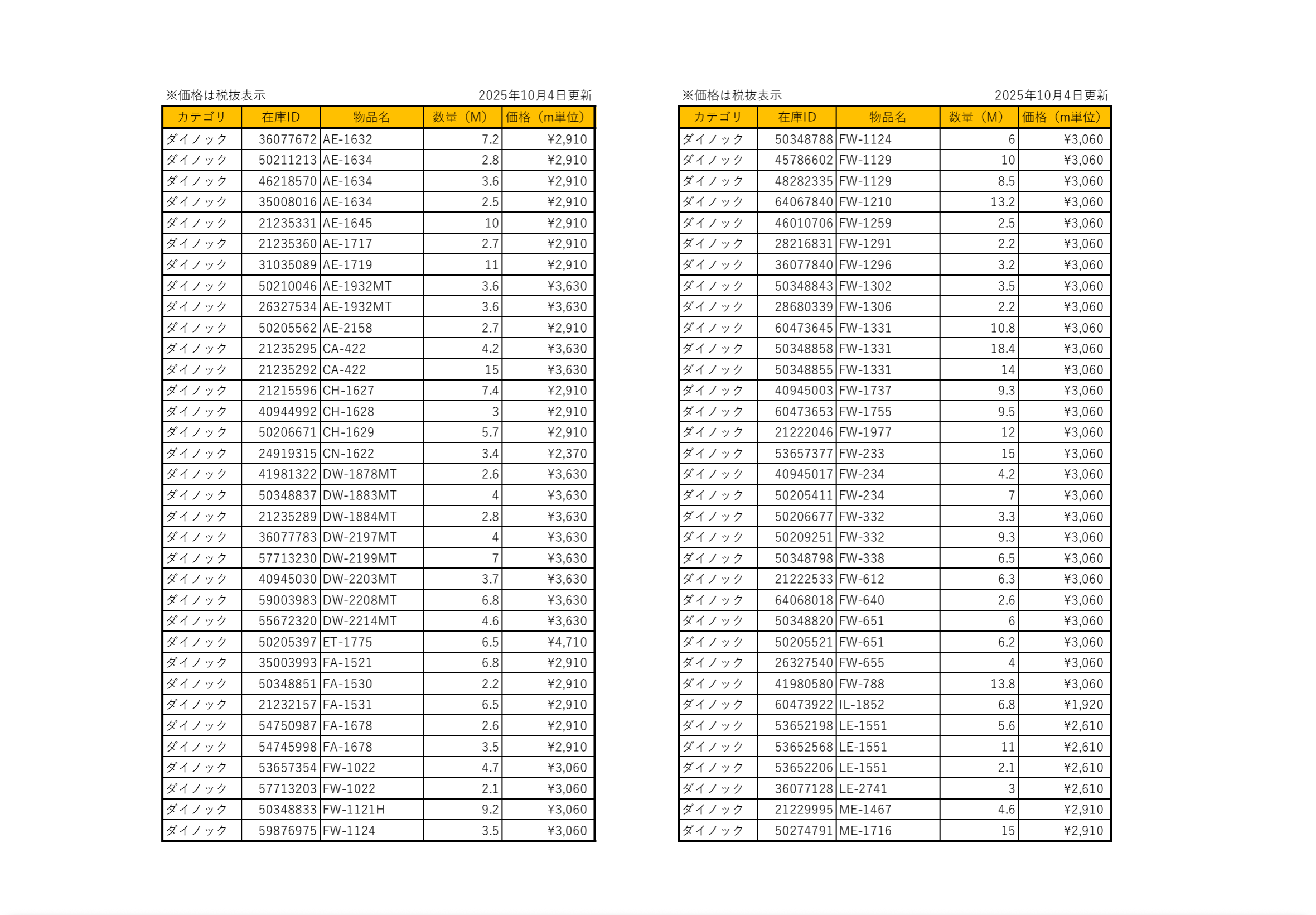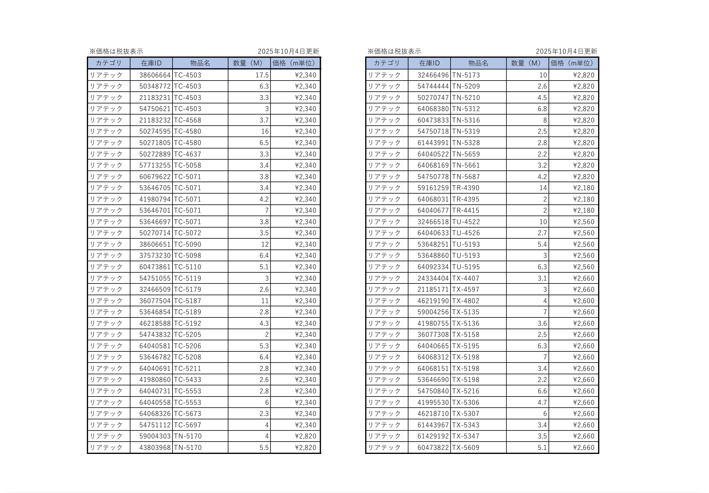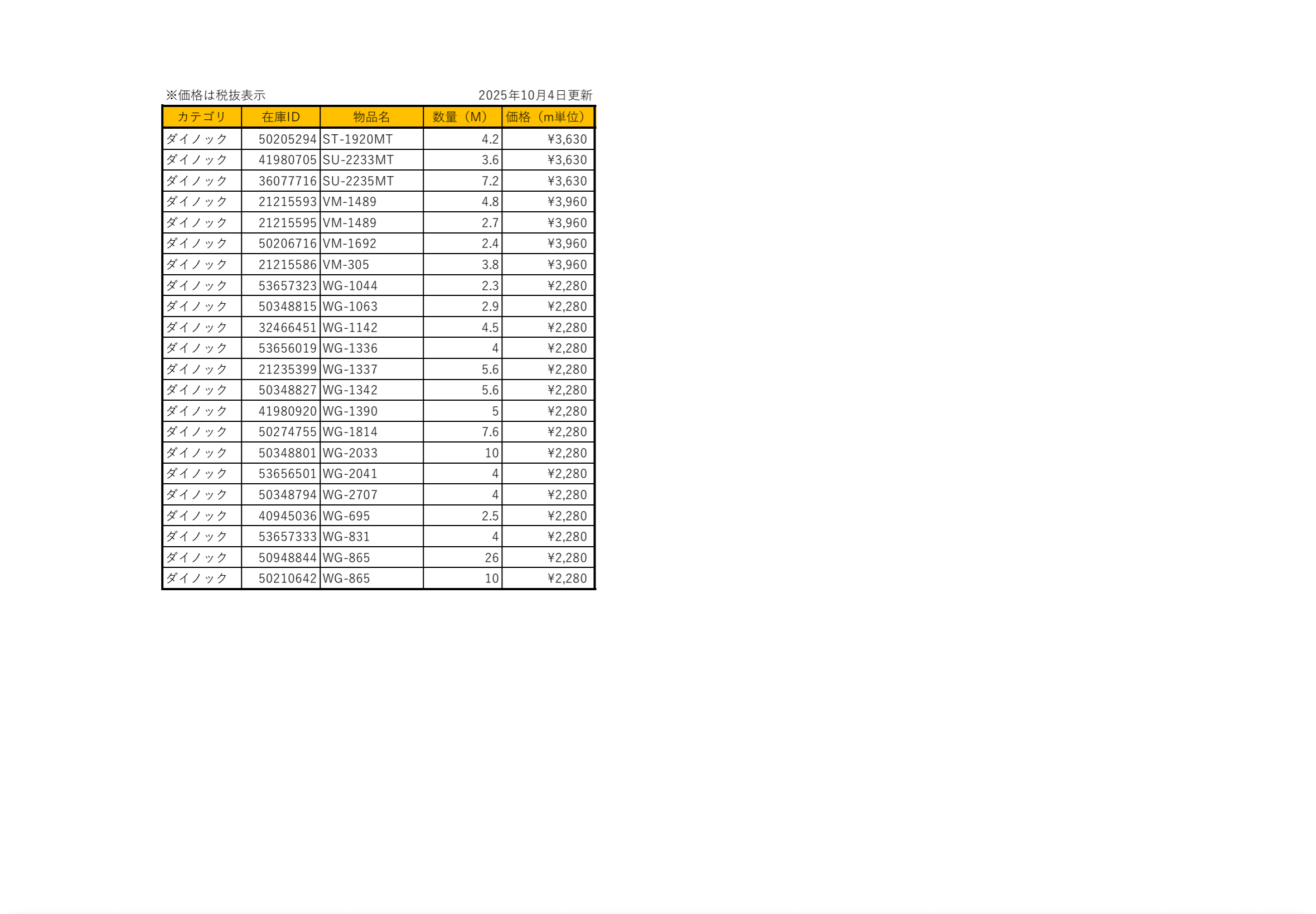毎週日曜に在庫表を更新いたします。